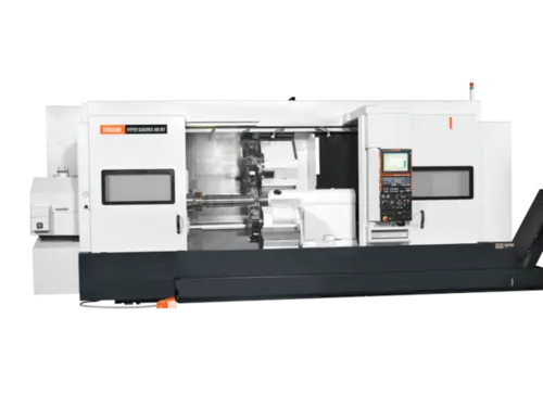 The HYPER QUADREX 400MY Multi-Tasking turning center brings high-volume throughput and heavy material removal to large-diameter part applications, including shafts and pipes. Its extreme performance capabilities are made possible via its twin-turret configuration, rotary milling capability, Y-axis off-centerline machining and integral motor/headstock with a large-diameter spindle bore.